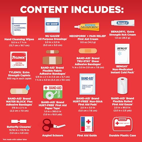 Medical kit includes BAND-AID Brand Adhesive Bandages in assorted sizes for minor wound care, as well as BAND-AID Brand First Aid Products such as gauze, non-stick pads & tape for larger wounds, all organized in a durable & accessible box