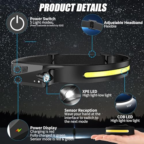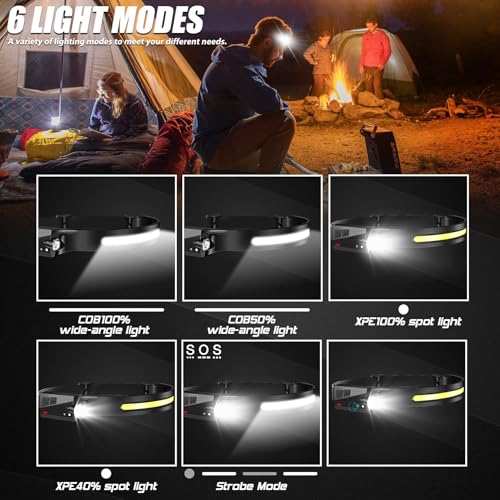 【5 Mode Head Lights】:The headlight offers 5 modes to suit your specific needs – COB high mode, COB low mode, XPE high mode, XPE low mode, and strobe mode. Switch between modes effortlessly for different lighting requirements. your lighting experience based on your needs and preferences