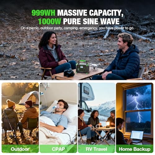 Portable Power Station 1000W (Peak 2000W), 999Wh Solar Generator, 110V Pure Sine Wave AC Outlet with PD 60W USB-C Fast Charging, Outdoor Camping RV Van Home Backup Off-Grid Living