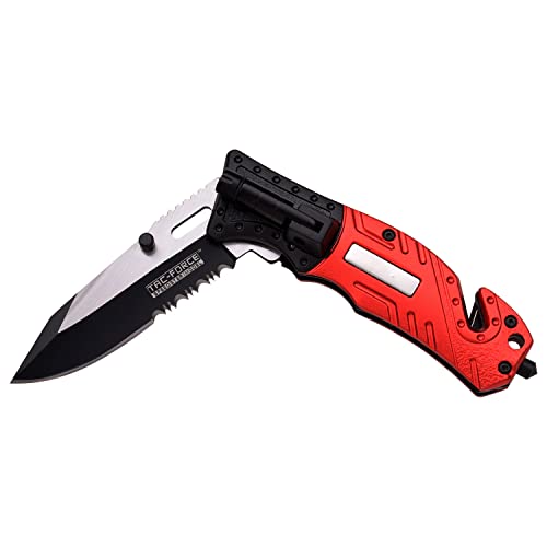 This spring assisted open folding knife from Tac Force offers easy one handed deployment. Once open, the blade locks securely into place with the use of its liner lock. This knife features a 3.25-Inch, 2.8mm thick, partially serrated stainless steel blade. The sturdy aluminum handle has a handy LED light that can really make tackling tasks in the dark a real breeze. The handle also has a seatbelt cutter and glass breaker on the end that can be used to punch out a car window in an emergency situation, making this a great rescue knife. This knife comes complete with a pocket clip for easy and safe carry. Measures 4.5 inches closed. Tac Force designs spring assist folding knives that offer the rapid deployment desired by emts, fire/rescue, and first responders. They’re available in a wide range of styles — from hunting to Tactical and Collectibles to Fantasy.